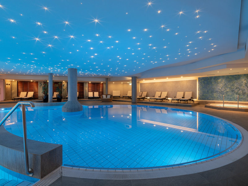 Genießen Sie wohltuende Wärme bei angenehmen 37 °C und unzähligen Massagedüsen. Den Kopf in den Nacken legen und beim Anblick der kleinen Sternenhimmel-Lichtchen träumen. Entspannen Sie sich in unserem Whirlpool.