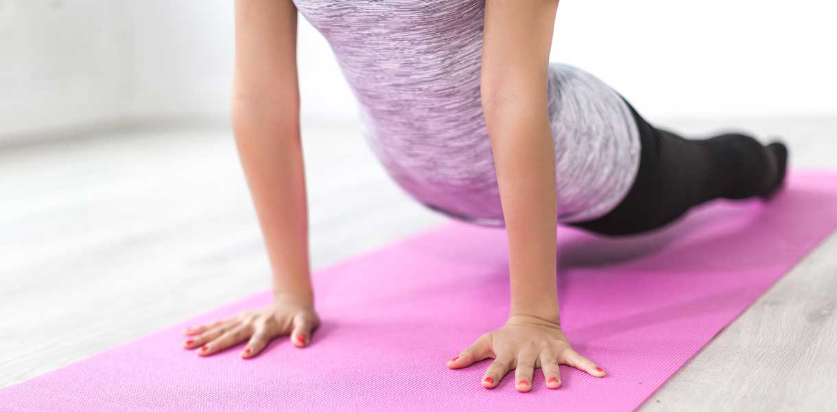 Eine Frau in Sportkleidung auf einer pinken Yogamatte in einem hellen Raum, in der Kindhaltung (Balasana) mit nach vorne ausgestreckten Armen und gesenktem Oberkörper.